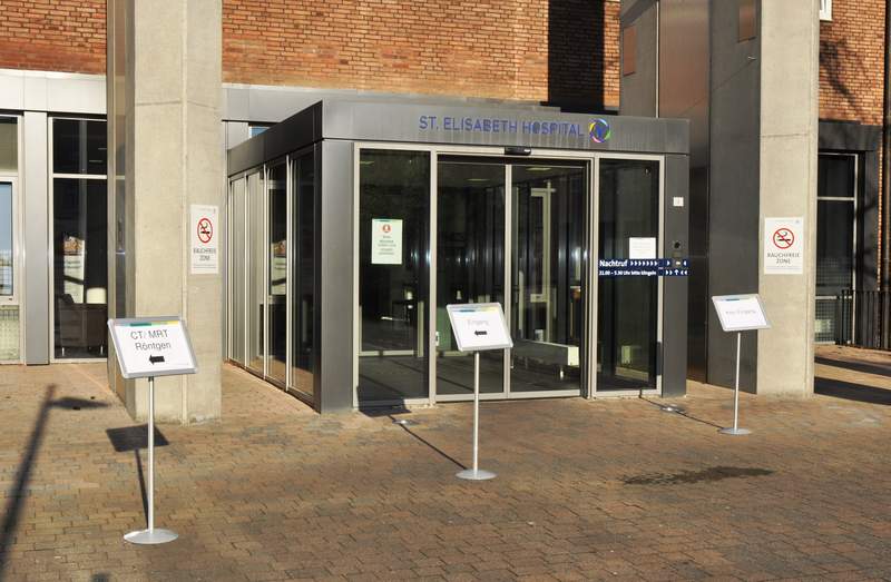 Vor dem Haupteingang weisen Schilder auf die neue Eingangssituation hin und lotsen Patienten zu der Seiteneingangstür der Cafeteria. Hier werden die Ankommenden von Mitarbeitern des Krankenhauses begrüßt und weitergeleitet.